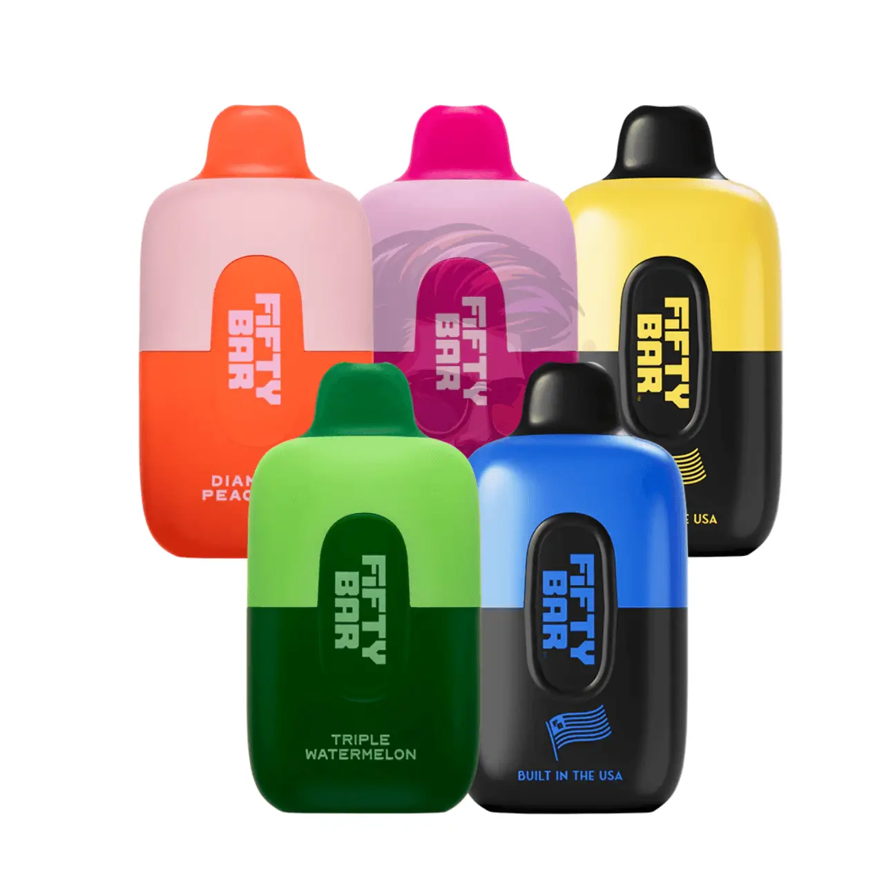 The top flavors for Fifty Bar include: Blue Razz Ice, Lush Ice, Mango Peach, Strawberry Banana, and Grape Soda.